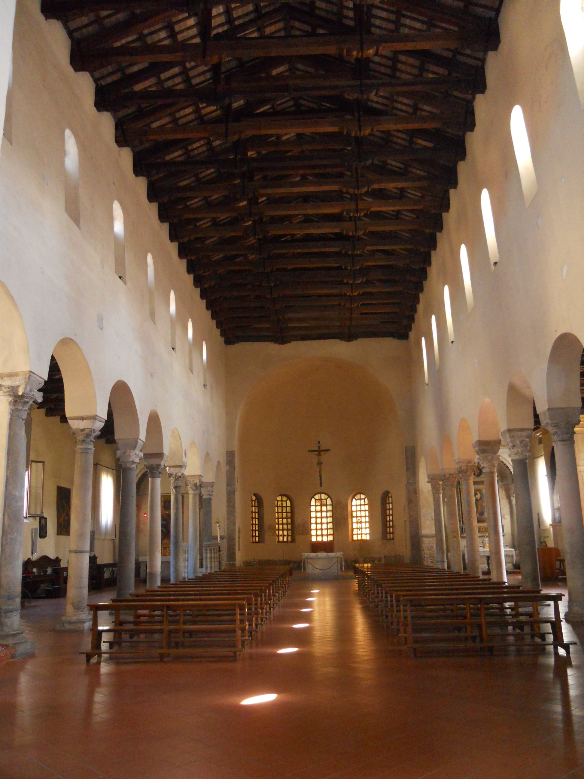 Les murs apparaissent gâchisl'effet de la suppression de la décorations baroques au 20ème siècle. La nef est couverte de fermes en boisremplacés dans la 1980s. Sur la gauche de l'arcade est gravée l'inscription monogramme de l'évêque Pierre IIavec les lettres "P" et "E" (Petrus Episcopus). Dans le cadre de lahuitième arc à gauche est le chaire, en Marbre grec veinéde forme semi-cylindrique avec une frise décorée de feuilles et perles. I piliers de l'abside sont en vue.