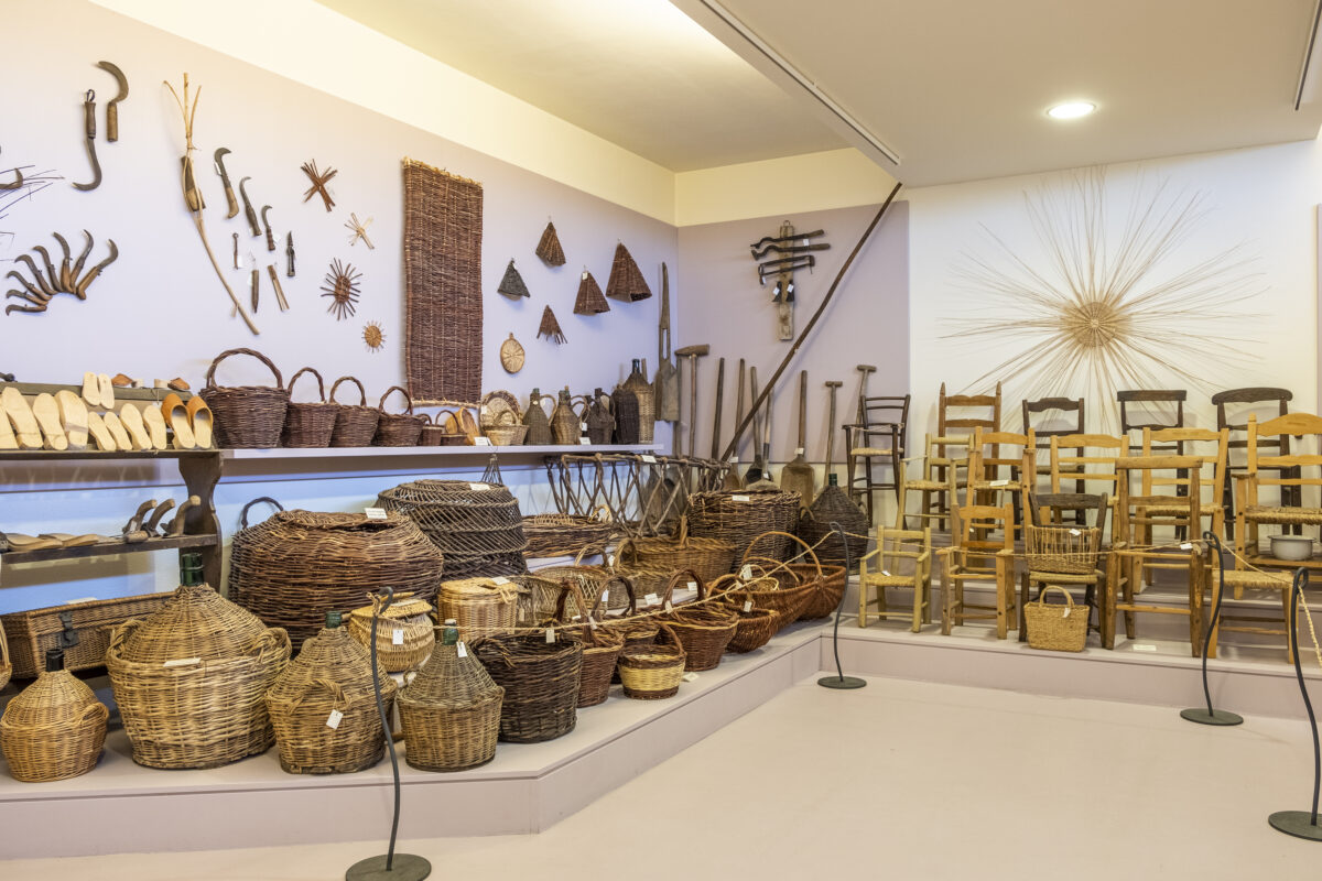 Gli strumenti e i manufatti: antiche falci, aghi da intreccio, telai, corde e forme di legno raccontano la manualità di un artigianato che univa funzionalità ed estetica.